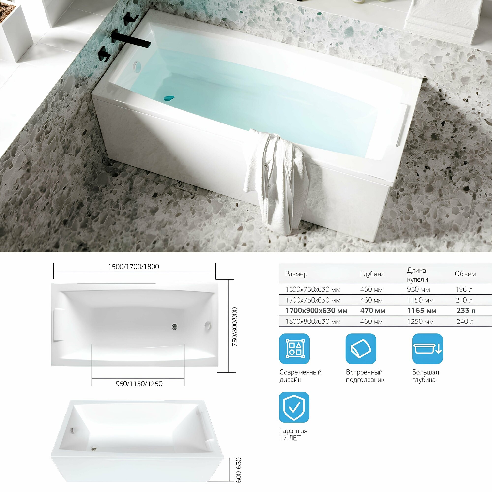 | Плюсы: | Четкие контуры дизайна, крепкий материал, ванна большая 180 см. |
