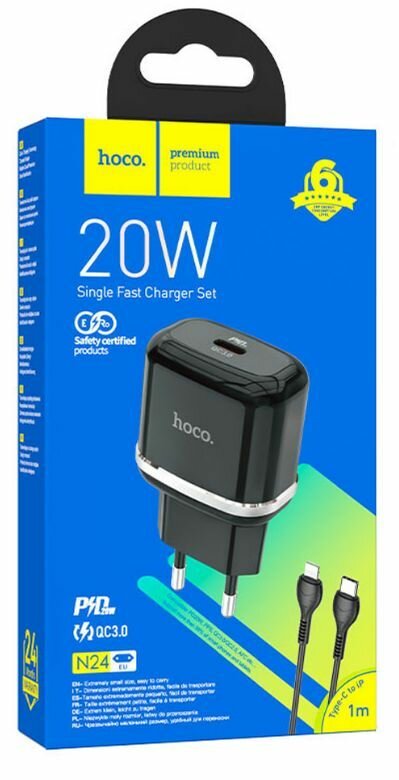 Сетевое зарядное устройство, 1 PD 20W, 3.0 QC (N24), HOCO, Type-C to Lightning, черный
