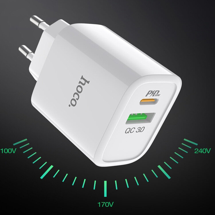 Сетевое зарядное устройство, 1 USB 3.0 QC+1 PD 18W (C57A), HOCO, белый