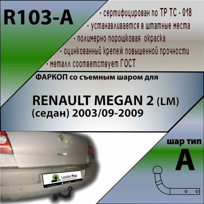 Фаркоп(прицепное) Лидер-Плюс для RENAULT MEGAN 2 (LM) (седан) 2003/09-2009(паспорт и сертификат в комплекте)(без электрики)R103-A