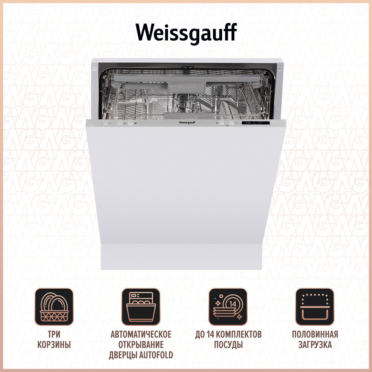 Встраиваемая посудомоечная машина c лучом на полу и авто-открыванием Weissgauff BDW 6063 D (модификация 2024 года), 3 года гарантии, 3 корзины, 14 комплектов, 7 программ, Половинная загрузка, Быстрая мойка 30 мин, Авто программа, Полная защита от протечек