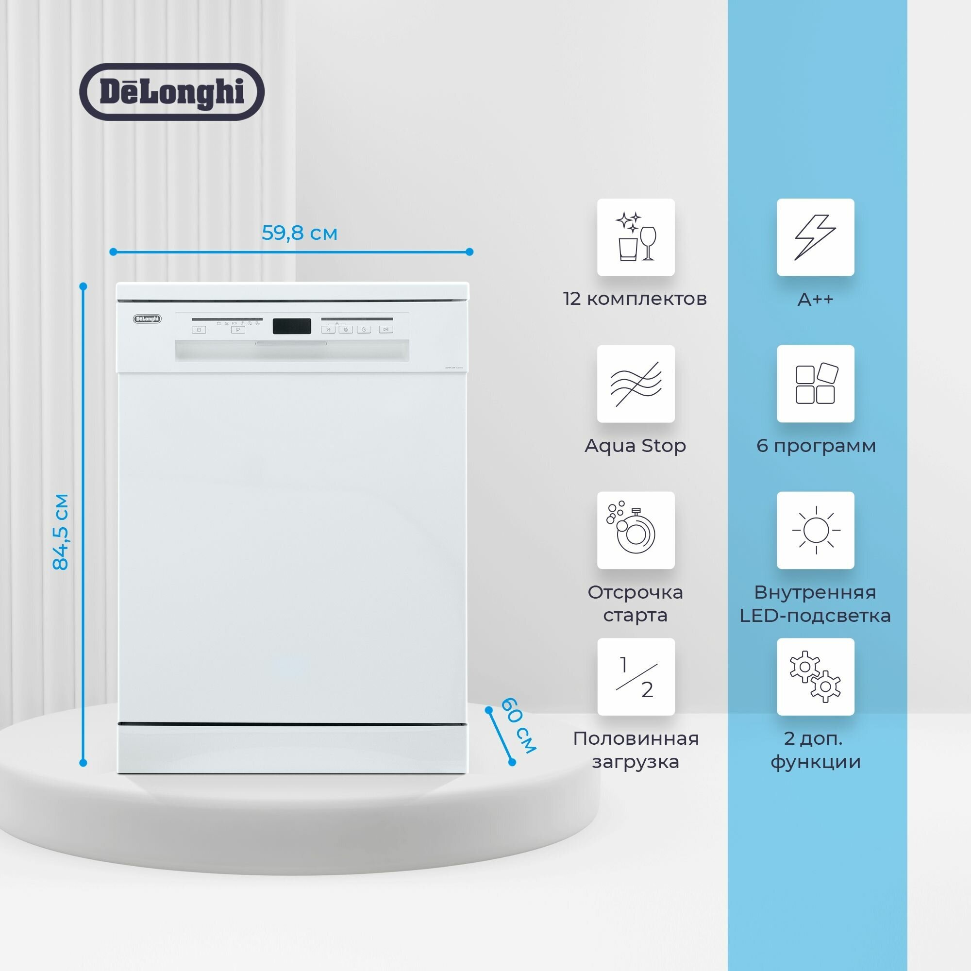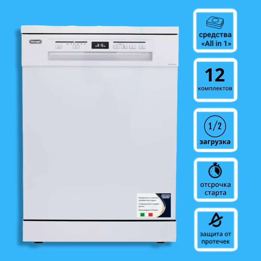 Пoсудoмoечная машина DeLonghi DDWS 09F Citrino, белая, 60 см, Aqua Stop, 12 комплектов, подсветка, половинная загрузка
