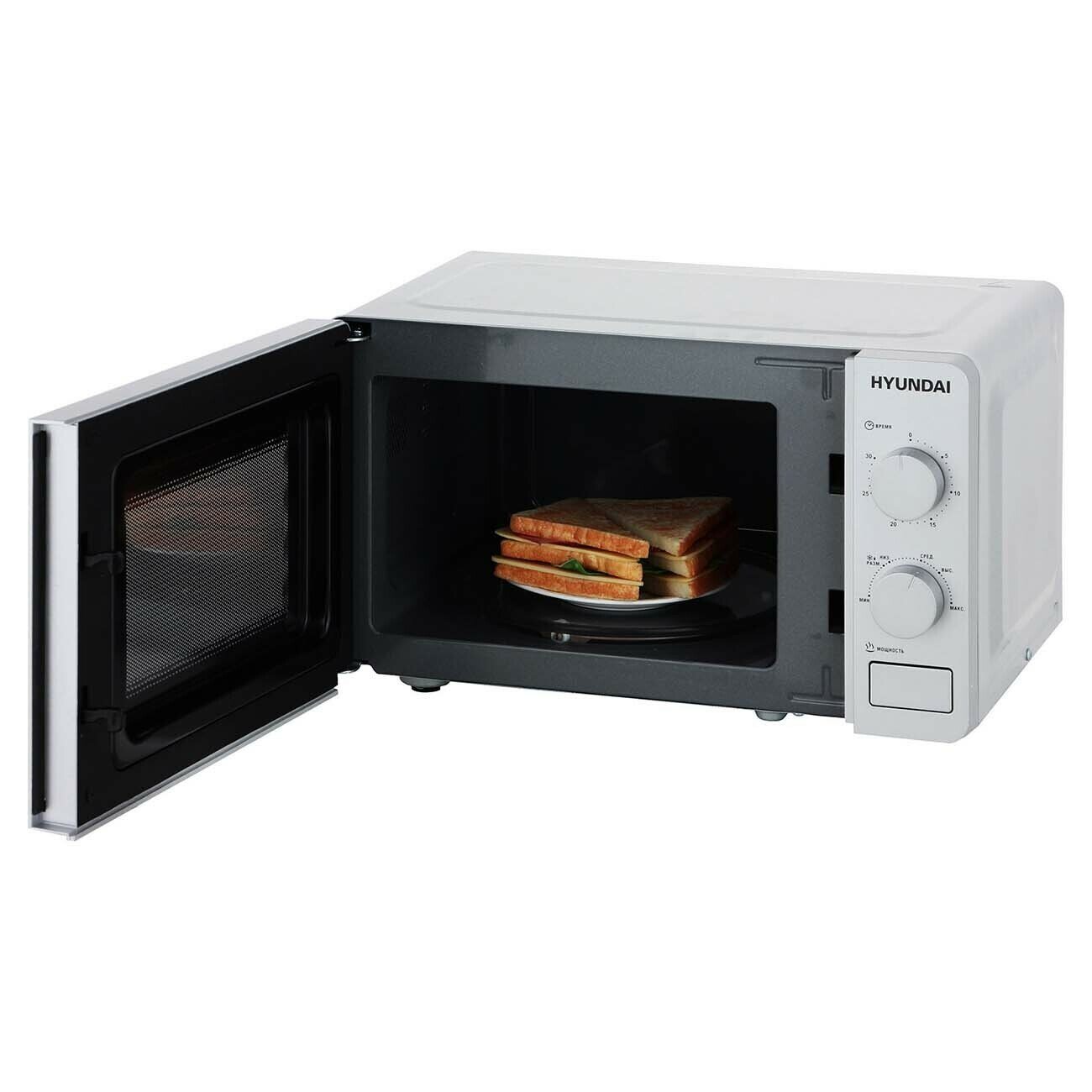 Микроволновая печь Hyundai HYM-M2001 серебристый, с механическим управлением, объем камеры 20 л, мощность 700 Вт, открывание дверцы кнопкой, функции разогрева и разморозки