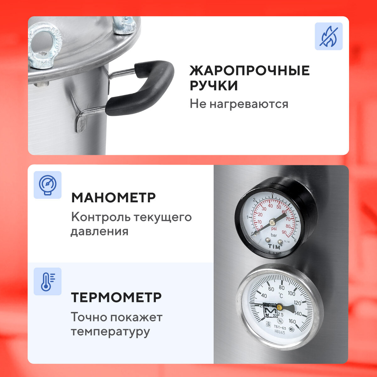 | Подробная комплектация | емкость автоклава – 1 шт.; крышка автоклава – 1 шт.; уплотнение крышки силиконовое – 1 шт.; фальшдно – 1 шт.; пластины для выравнивания – 2 шт.; кран сливной с носиком – 1 шт.; циферблат биметаллического термометра – 1 шт.; гильза биметаллического термометра – 1 шт.; манометр аксиальный (осевой) – 1 шт.; переходник-футорка – 1 шт.; хомут клампа 1.5 дюйма – 1 шт.; уплотнение клампа 1.5 дюйма – 1 шт.; заглушка под обратный клапан – 1 шт.; обратный клапан с гайкой – 1 шт.; кран воздухоотводный – 1 шт.; защитный клапан 1.5 bar – 1 шт.; переходник на кран для шланга – 2 шт.; рым-гайка м8 – 8 шт.; шланг для отвода пара – 2 метра; инструкция по эксплуатации |