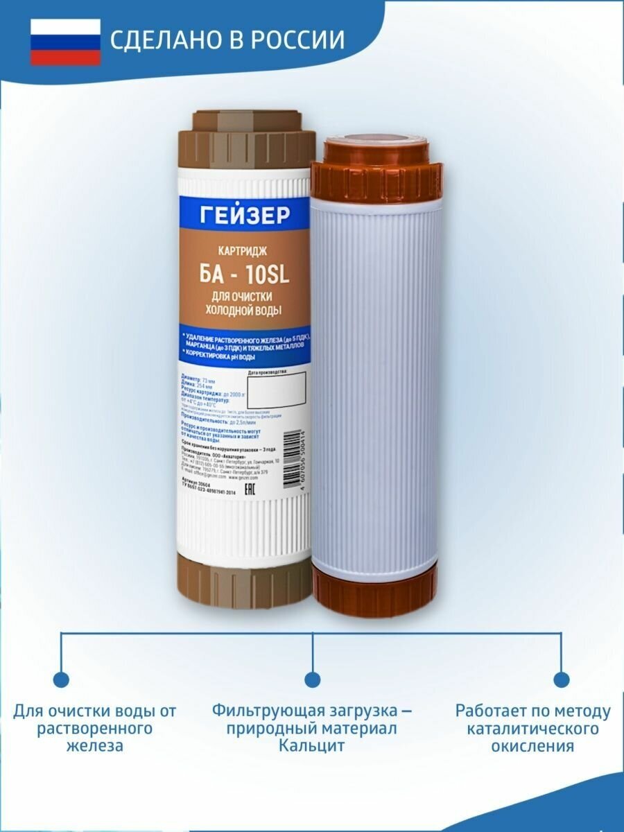 Картридж Гейзер БА 10SL, эффективная очистка воды от избыточного растворенного железа, достигает удаление до 1 мг/л, 30604