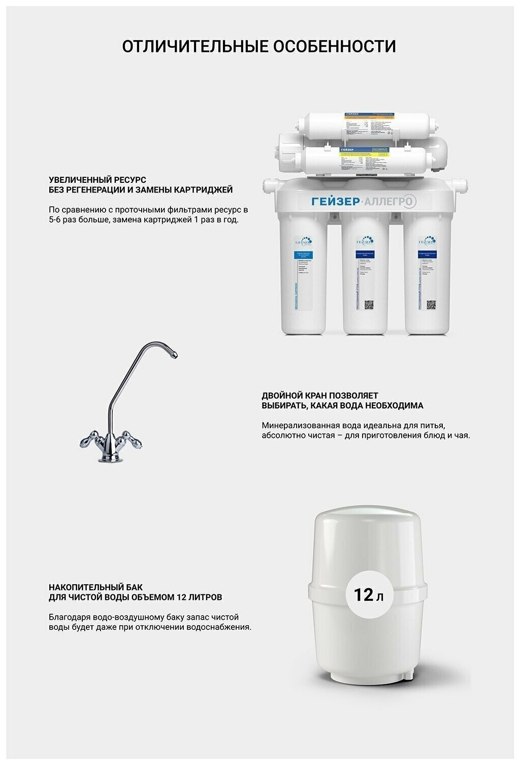 Система обратного осмоса Гейзер Аллегро, глубокая очистка воды от различных примесей, включая бактерии и вирусы, 20036