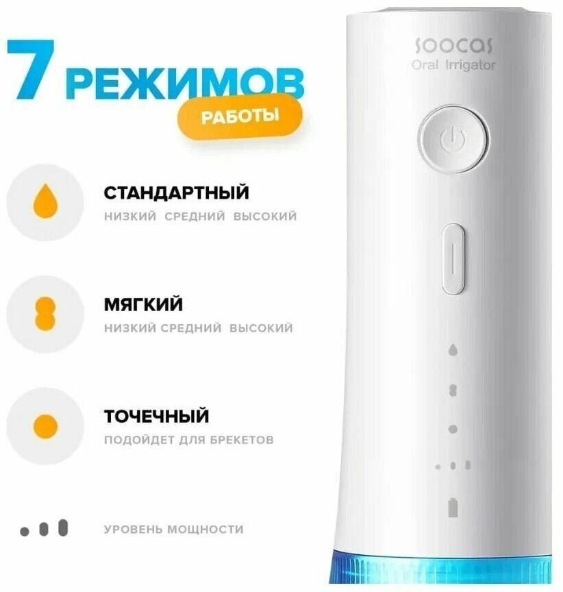 Ирригатор портативный для полости рта Soocas W3 PRO, 4 насадки, кейс для насадок в комплекте, 7 режимов, голубой