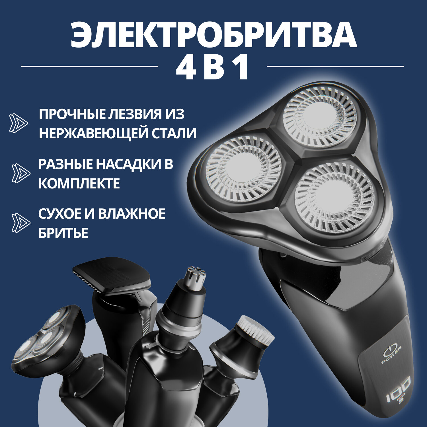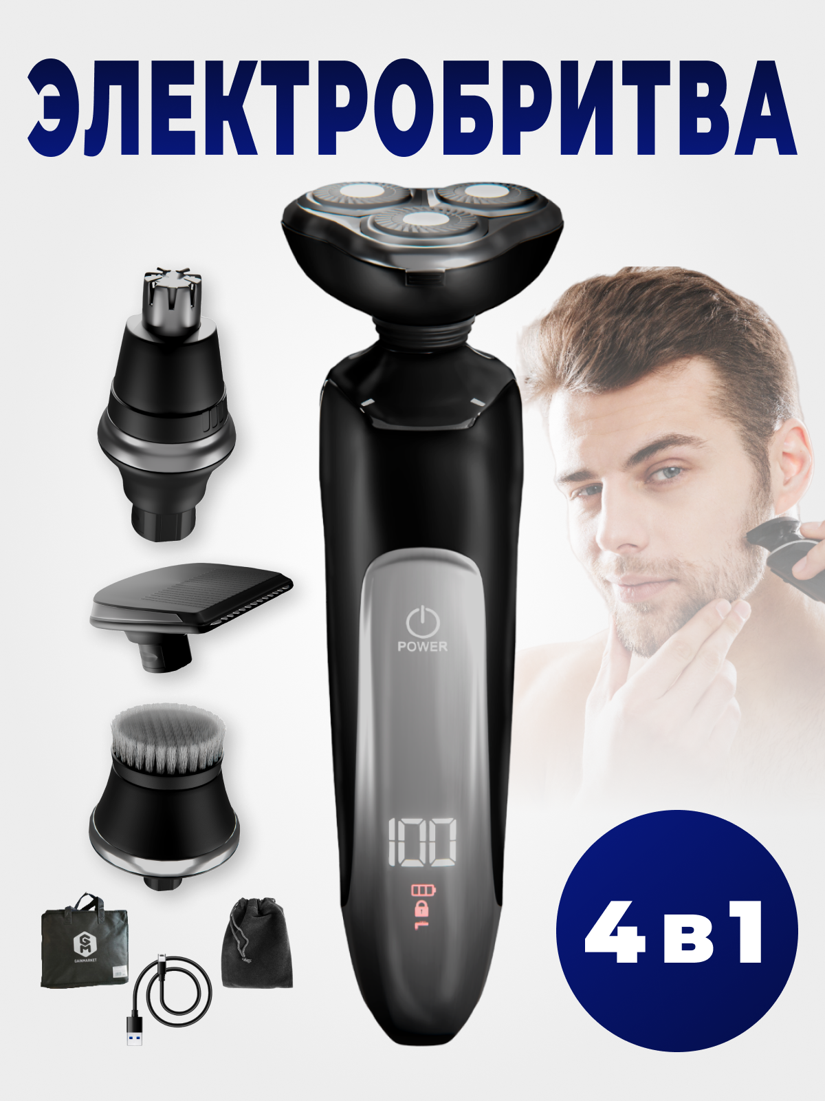 Электробритва мужская для лица беспроводная, электрическая бритва 4 в 1, триммер для носа и ушей, машинка для стрижки волос, бритва для бороды и усов