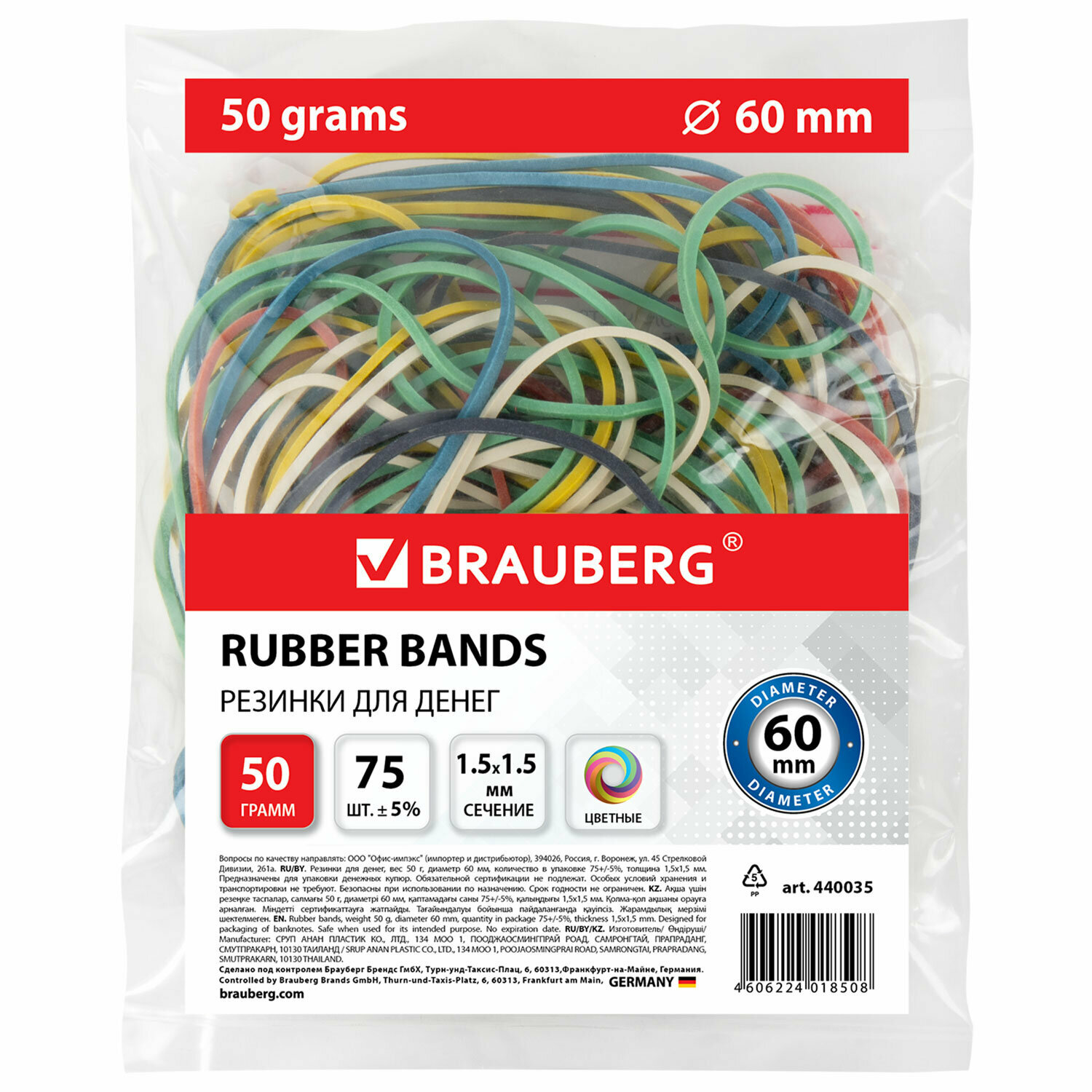 Резинки банковские денежные для купюр канцелярские универсальные диаметром 60 мм, Brauberg, 50 г, цветные, натуральный каучук, 440035