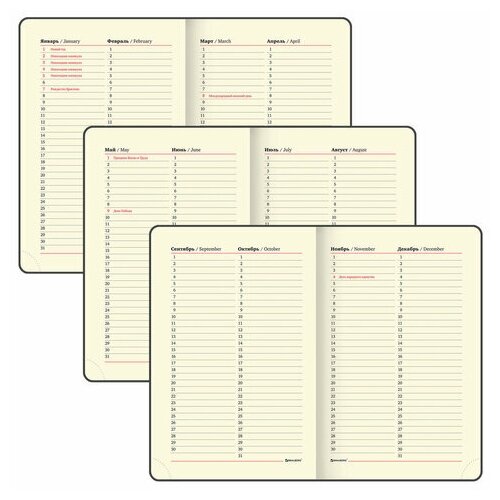| Минусы: | Недатированный-Фактически 136 не чистых листов,учитывайте это при расстановке дат,так как часть занимают справочные данные,календари и т.д.365дней не удастся разместить в нем-придется исключать выходные |