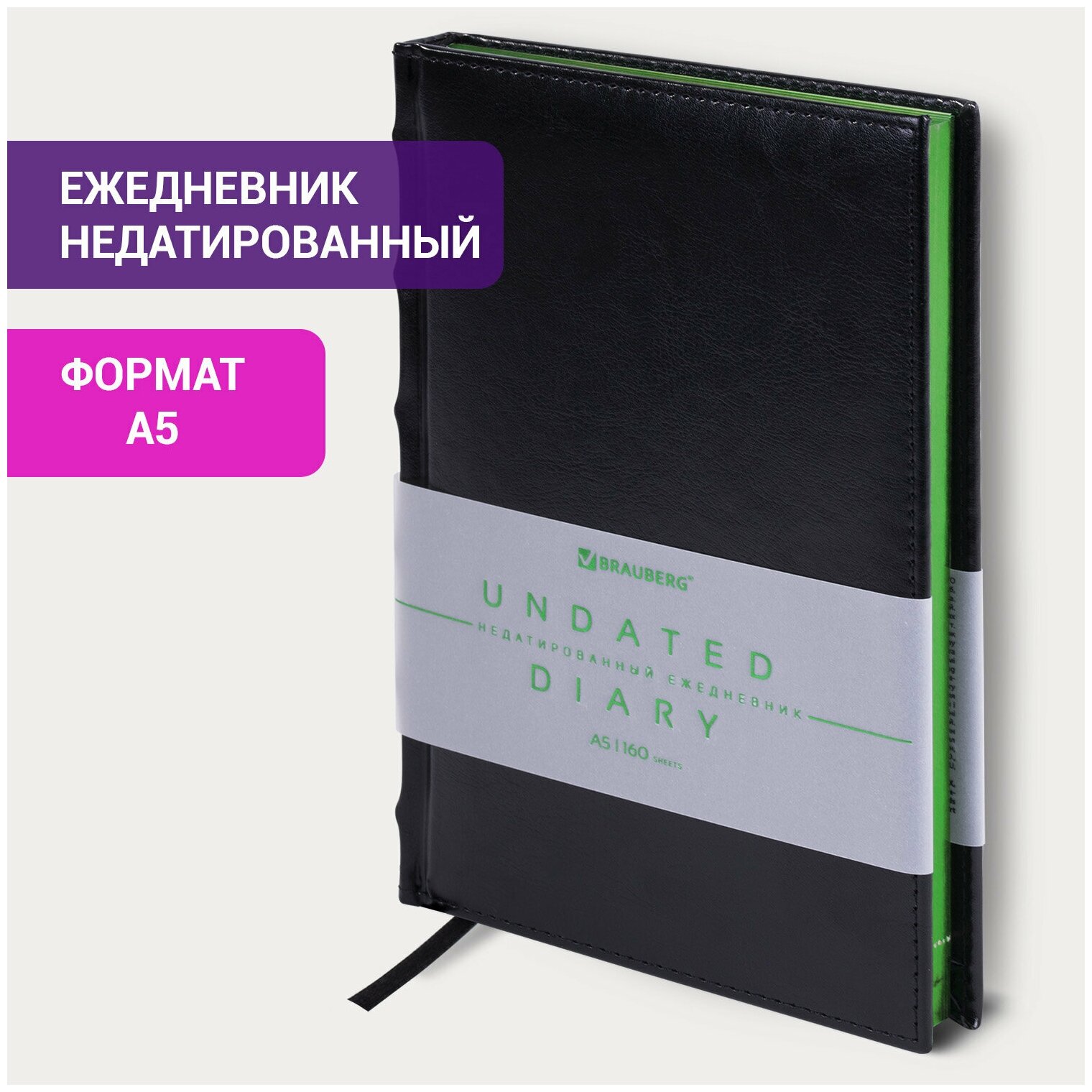 Ежедневник недатированный А5 138х213 мм BRAUBERG "FLAME", под кожу, 160 л., черный, зеленый срез, 113428, 113428
