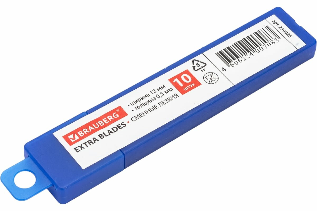 Лезвия для ножей 18 мм BRAUBERG, комплект 10 шт., толщина лезвия 0,5 мм, в пластиковом пенале, 230925 (цена за 1 ед.товара)