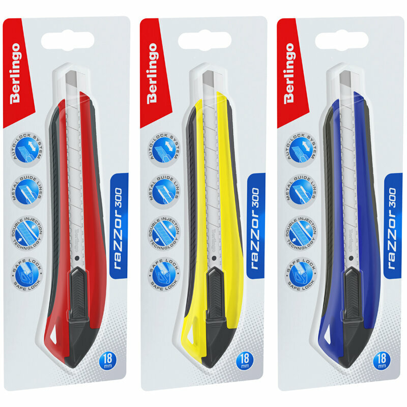 Нож канцелярский 18мм Berlingo "Razzor 300", auto-lock, металл. направл., мягкие вставки, ассорти, европодвес И 4260753550597