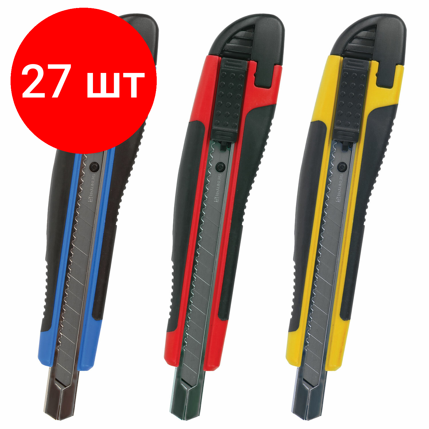 Комплект 27 шт, Нож канцелярский 9 мм BRAUBERG "Universal", автофиксатор, цвет ассорти, резиновые вставки, блистер, 236970