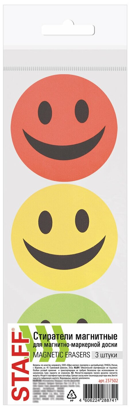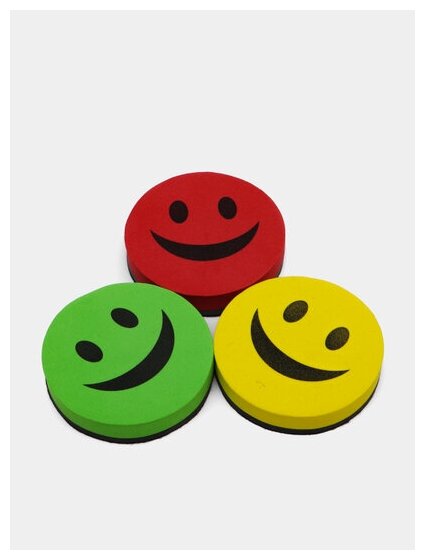 Стиратели магнитные для магнитно-маркерной доски, диаметр 90 мм, «Смайлик», комплект 3 ШТ., STAFF «Basic», ассорти, 237502. 237502 интересное: