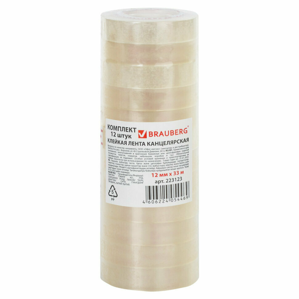 Клейкая лента канцелярская BRAUBERG 12 мм х 33 м канцелярские , комплект 12 шт., прозр., 223123