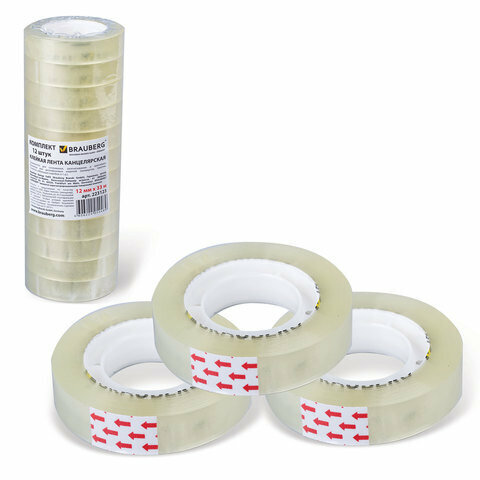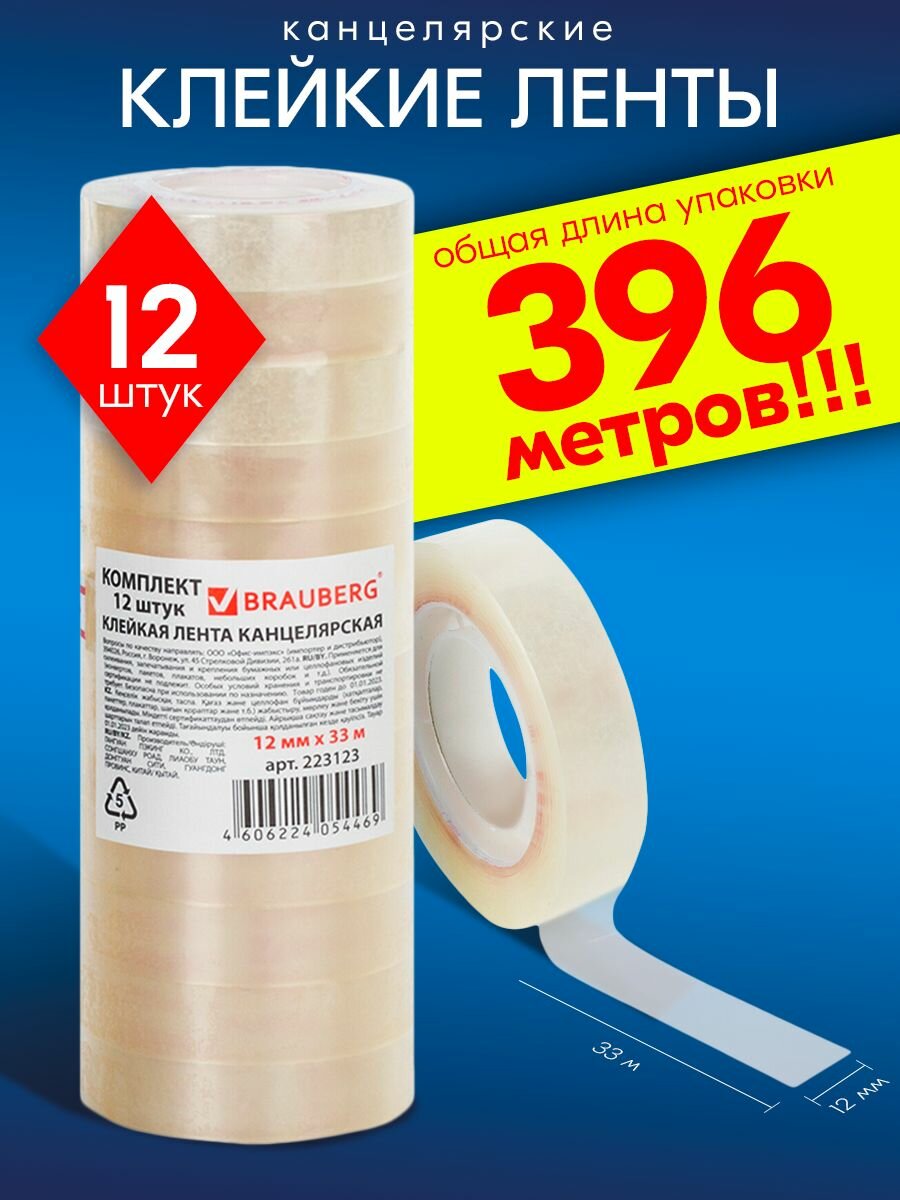 Клейкие ленты 12 мм х 33 м канцелярские Brauberg, комплект 12 шт, прозр, гарант. длина, 223123