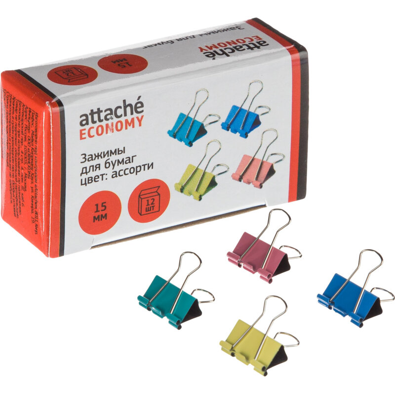 Зажим д/бумаг 15мм, 12 шт/уп Attache Economy, цветные, в карт.коробке 1238038