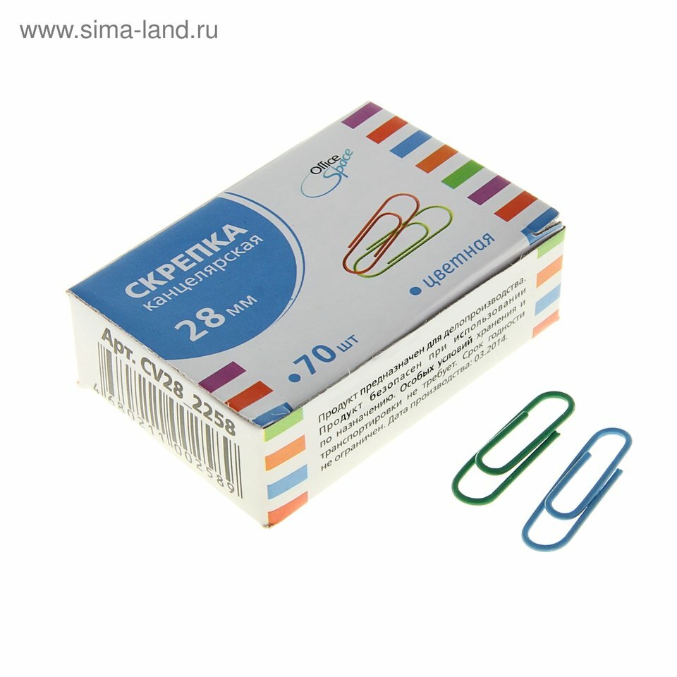 Скрепки 28мм, OfficeSpace, 70шт., цветные, карт. упаковка - 30 шт. интересное: