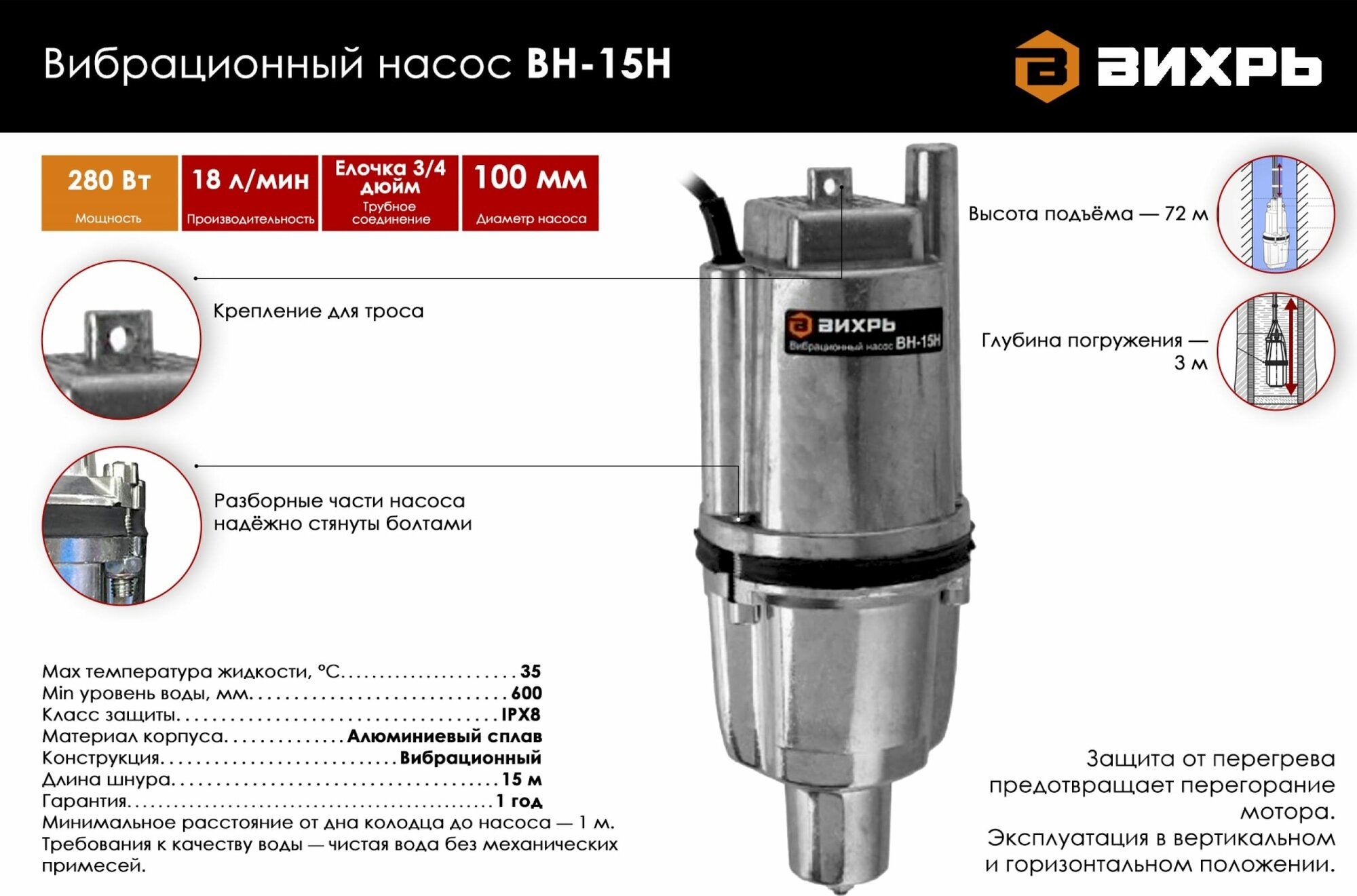 СохранитьВихрь ВН-15Н Насос погружной вибрационный 280Вт 18л/мин. глубина погружения 3м подача 72м нижний забор вихрь интересное: