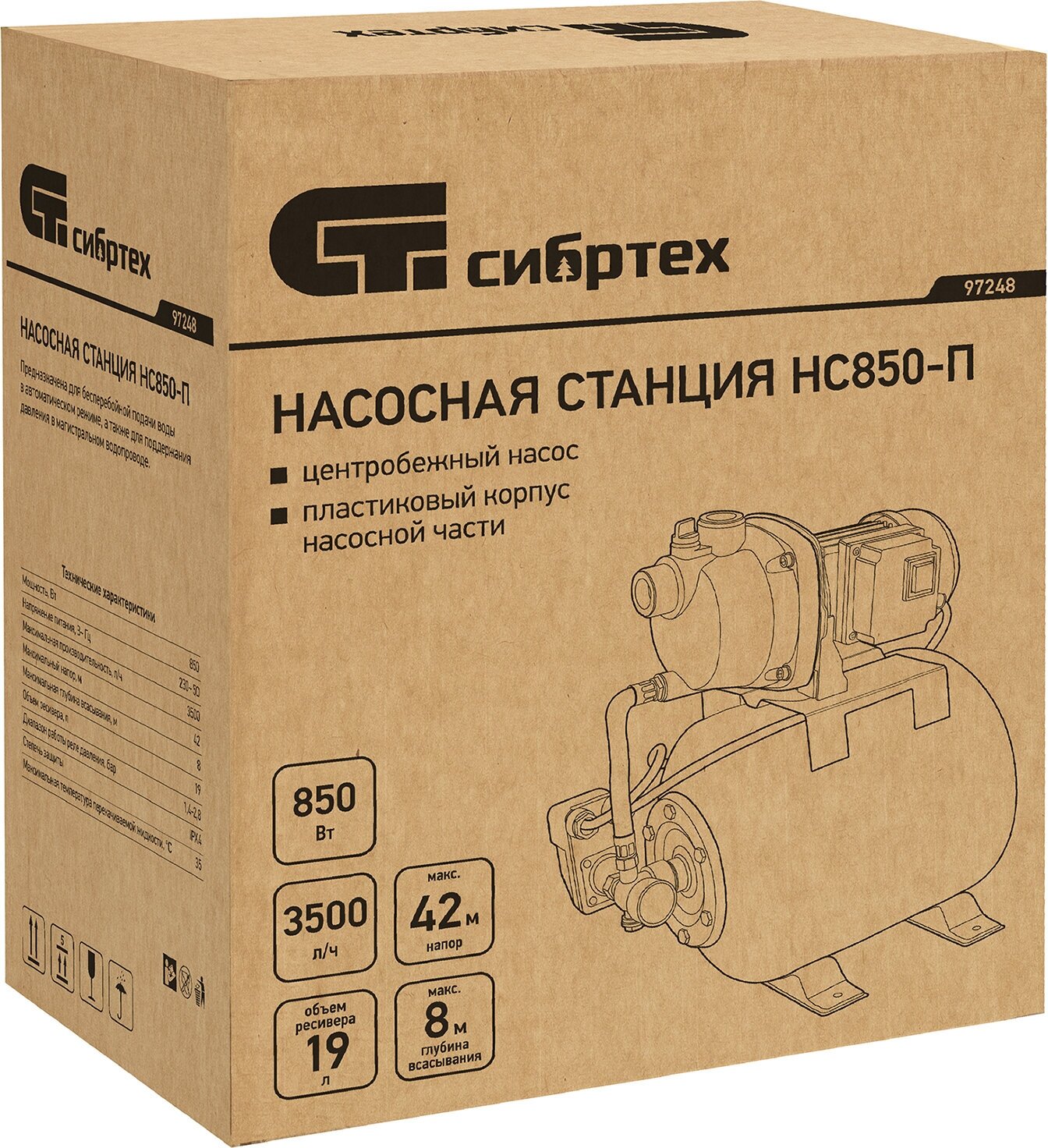 Насосная станция НС850-П, 850 Вт, напор 42 м, 3500 л/ч, ресивер 19 л Сибртех