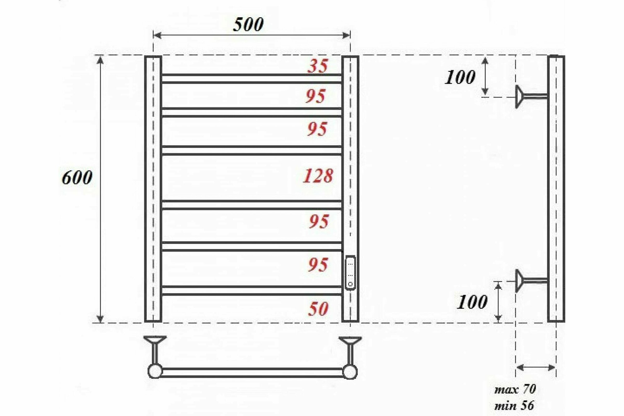 Полотенцесушитель электрический 500x600 POINT Аврора (PN10856 П6) диммер справа