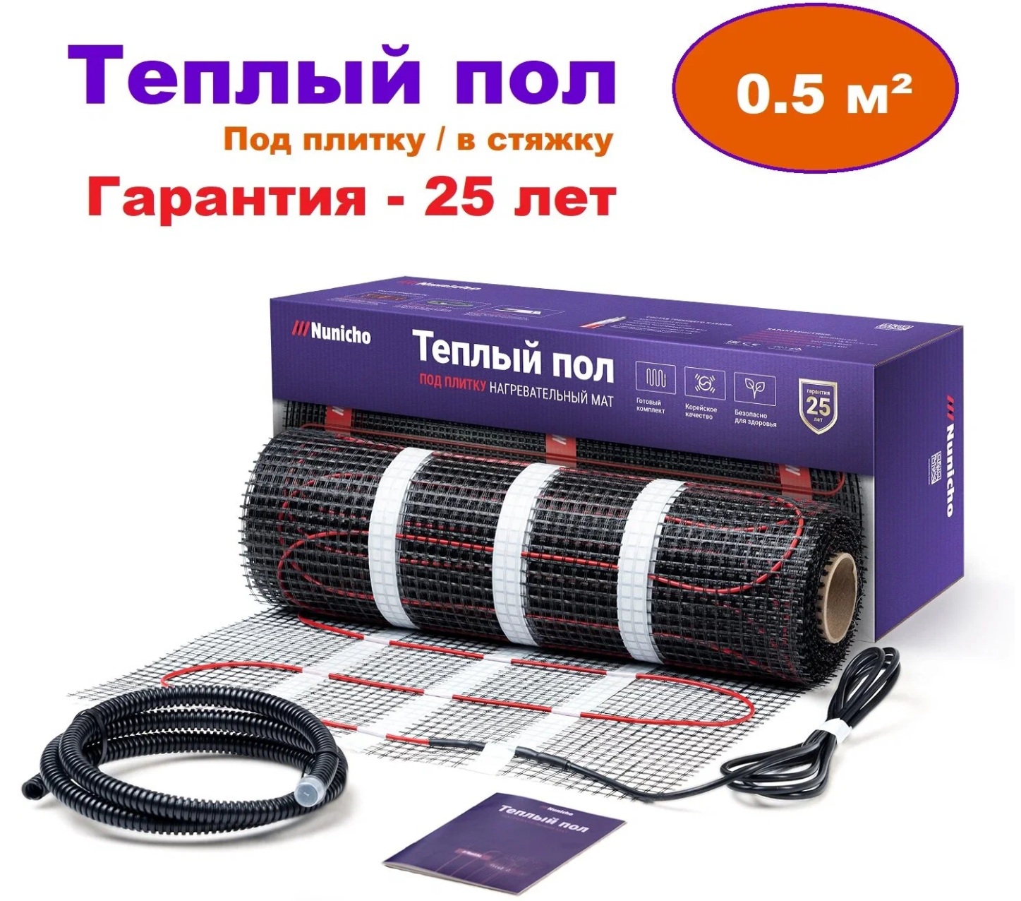 Теплый пол электрический под плитку 0,5 м2 Nunicho 200 Вт/м2 с терморегулятором программируемым черным, нагревательный мат пр-во Южная Корея