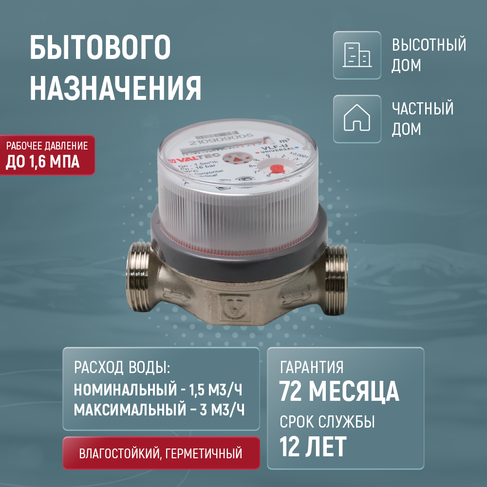 Водосчетчик VALTEC универсальный квартирный без сгонов, до +90С, 1,5м3, 1/2, 80 мм