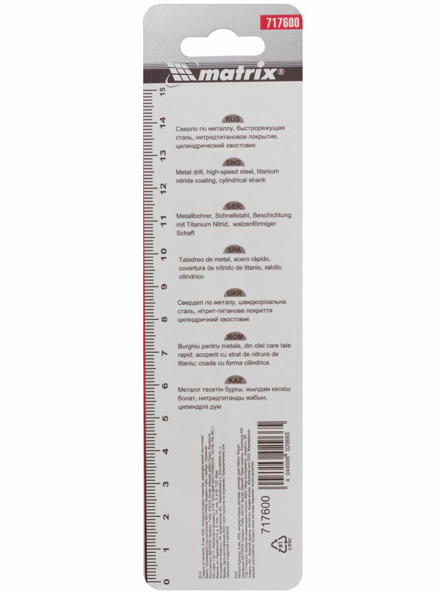 Сверло MATRIX 717600, по металлу, 6мм, цилиндрический, 1шт