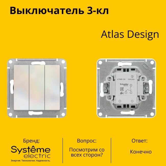 3 шт. Systeme Electric AtlasDesign Жемчуг Выключатель 3-клавишный сх.1+1+1, 10АХ, механизм, ATN000431