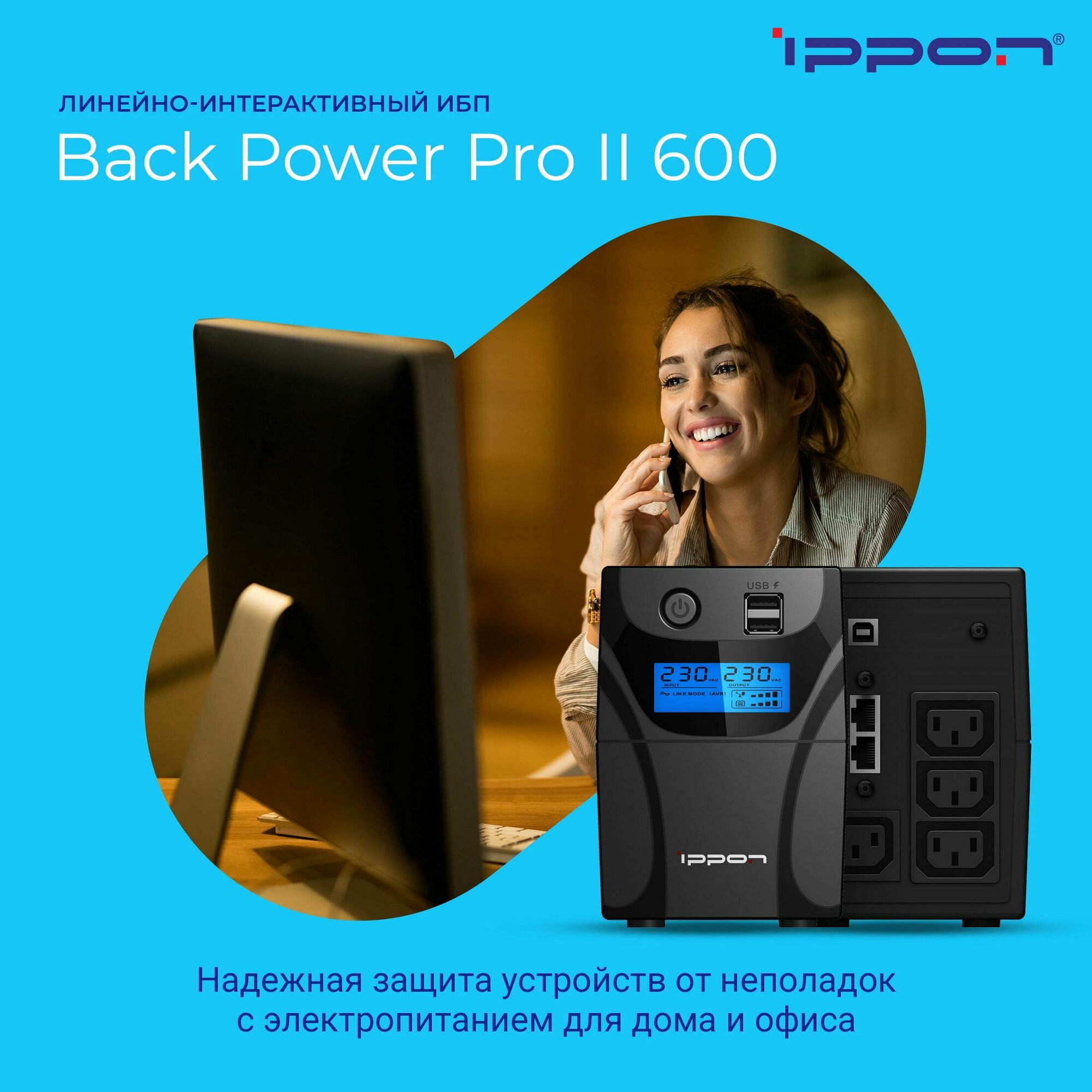 ИБП IPPON Back Power Pro II 600 LCD+USB+защита телефонной линии/RJ45 .