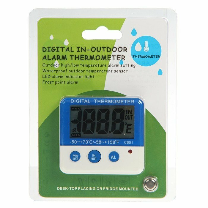 Дисплей хорошо виден под любым углом. Термометр с магнитным креплением или на подставке. Точно измеряет температуру внутри помещения и наружного воздуха. Узнать самую миним. и максим. температуру в памяти термометра, есть сброс. Есть светодиодный индикатор предупреждения о заморозках (от -1 до +4°C, эту температуру можно изменить), сигнализацию можно отключить. |