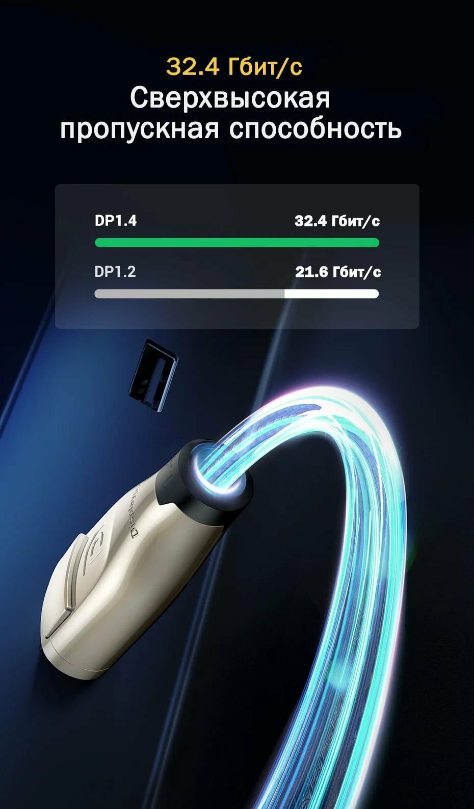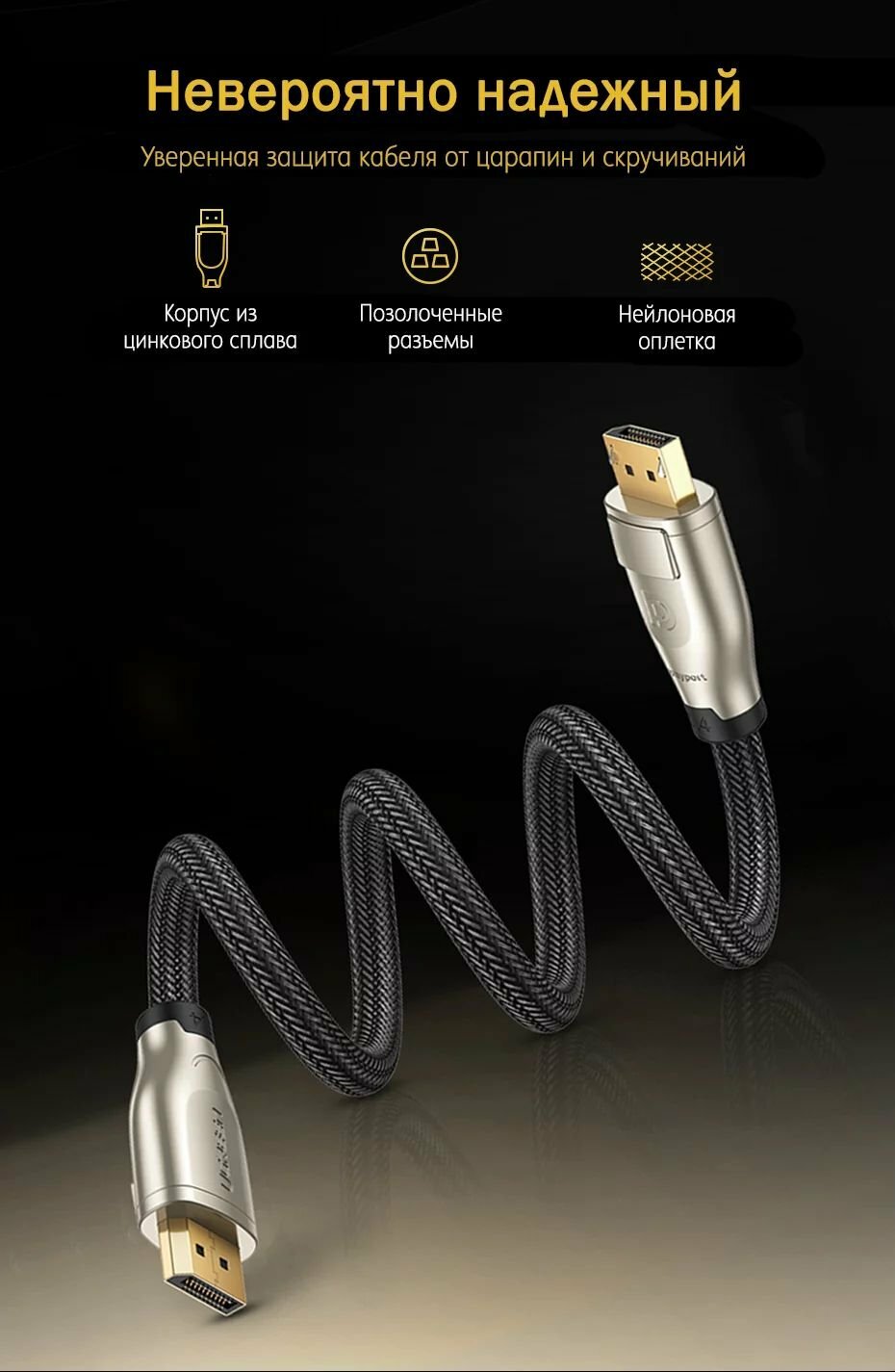 | Плюсы: | Качественный, хороший дизайн, красивая оплётка и разъёмы, брал для 2к монитора 165гц, хватает с лихвой, никаких нареканий |