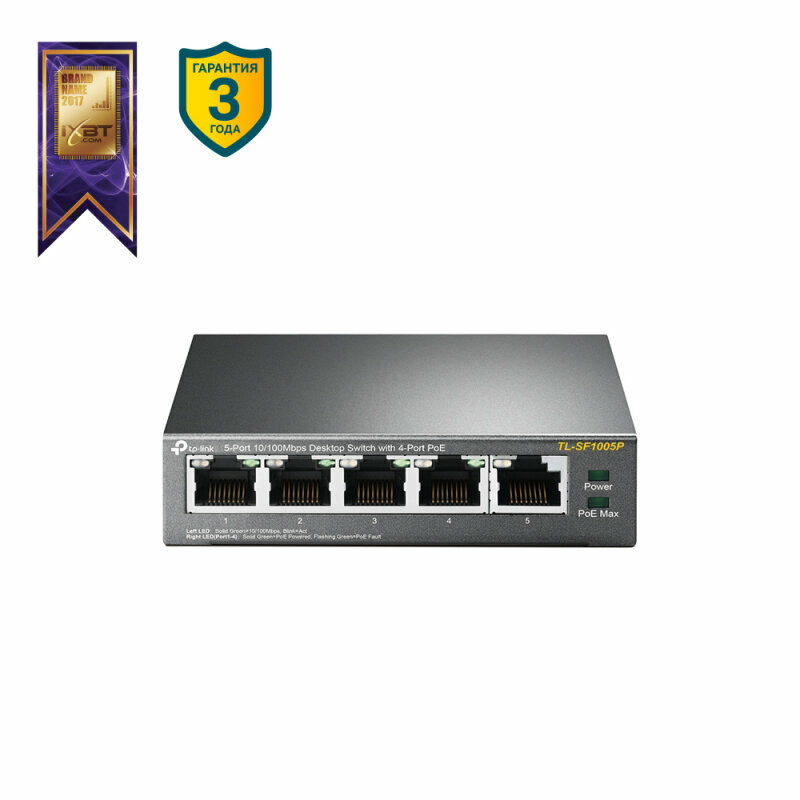Неуправляемый коммутатор TP-LINK TL-SF1005P,компактный, 5-портовый коммутатор с поддержкой PoE на 4 портах (802.3af; бюджет до 58 Вт на все порты, до 15.4 Вт на каждый порт)