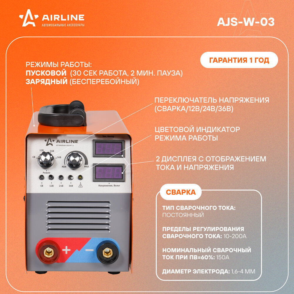 AIRLINE AJS-W-03 Пускозарядное устройство сварочный аппарат 12В/24В/36В/сварка 10-200А (от 220В) (AJS-W-03)