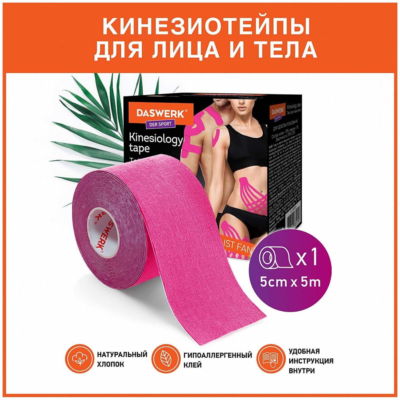 Кинезио Daswerk тейп/лента для лица и тела, омоложение и восстановление, 5 см х 5 м, розовый, , 680004