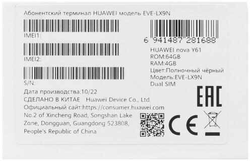 Купить Смартфон Huawei NOVA Y61, 64 Гб, черный