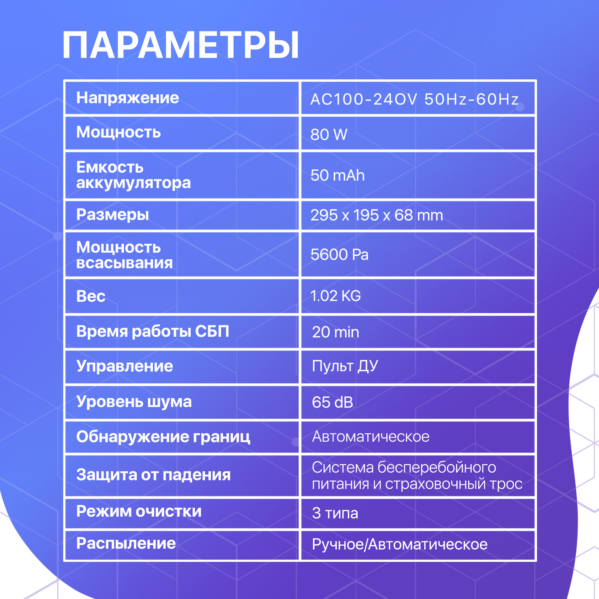 | Особенности | звуковая индикация / автоматическое определение зоны уборки / автоматическая остановка |
