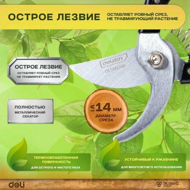 Секатор садовый Deli DL580200 для дачи, сада, огорода (макс. диаметр резки 14мм, металлические ручки, сталь)
