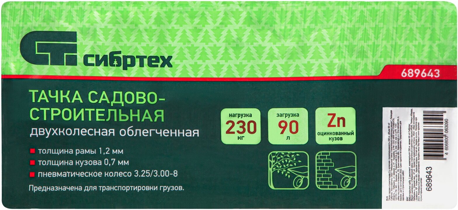 Тачка садово-строительная СИБРТЕХ 689643 230 кг, 90 л.