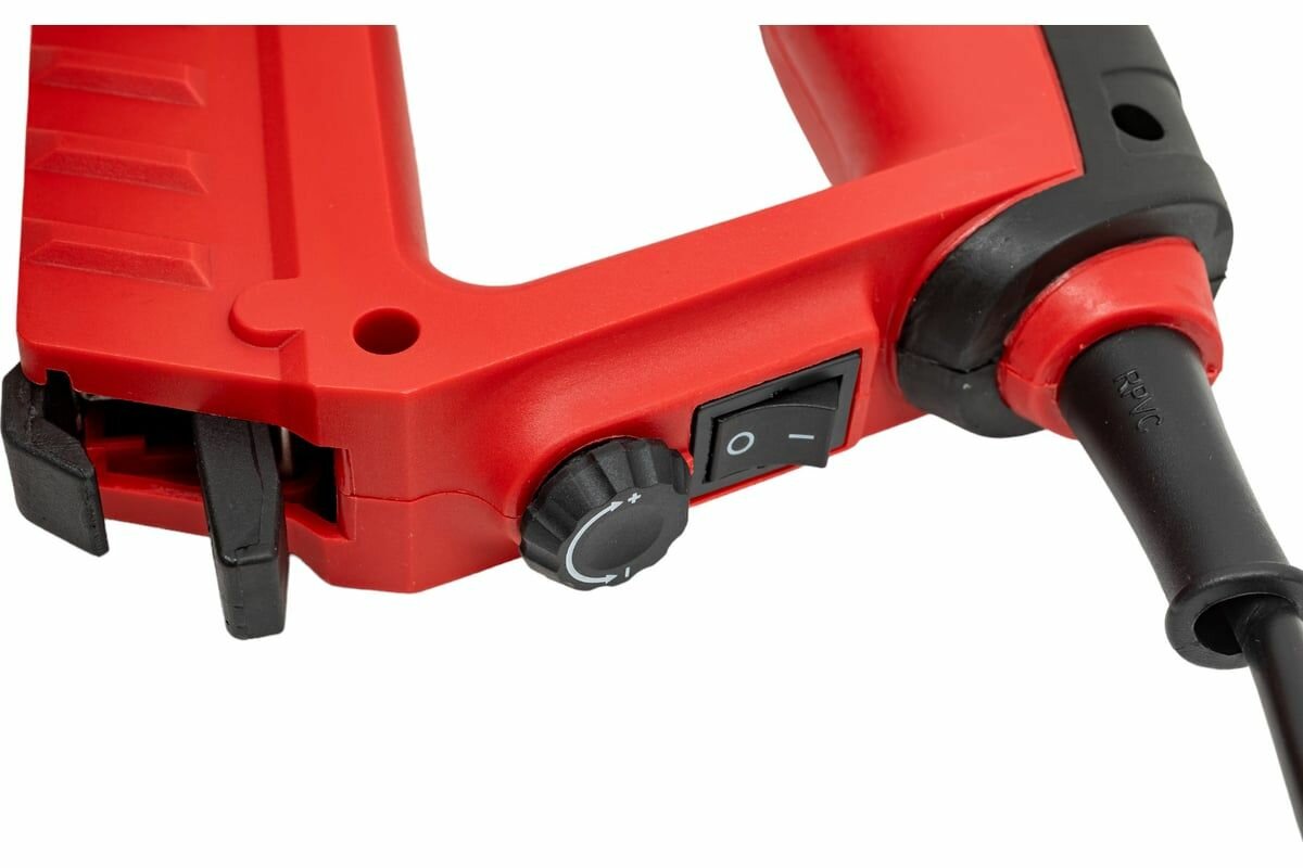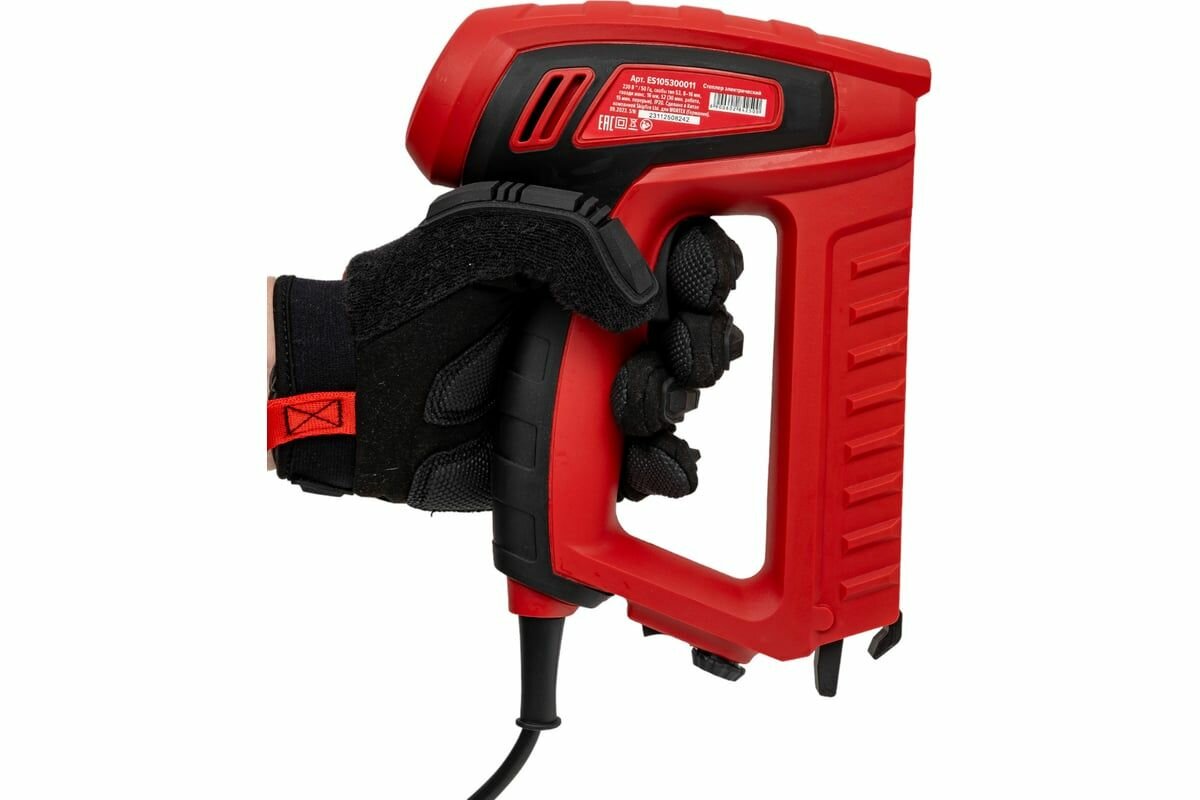 | Плюсы: | Нетяжелый. Удобно держать в руке при работе. Есть блокатор. Скоба выстреливает только после нажима на носик, что тоже обезопашивает при использовании. |