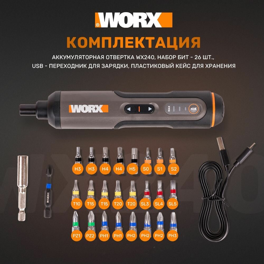 Отвертка аккумуляторная WORX WX240 / 26 бит в комплекте / кейс для хранения