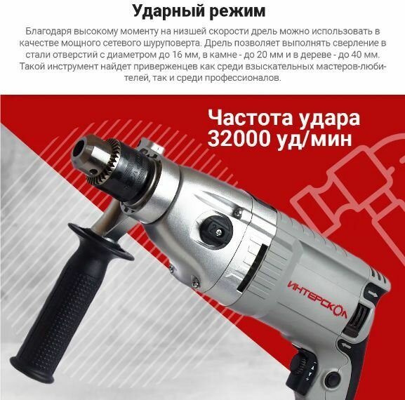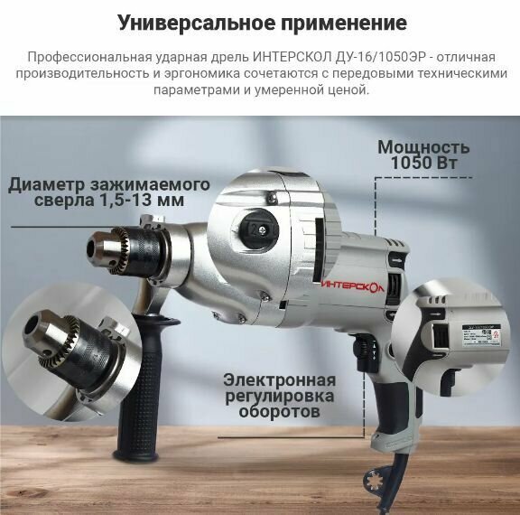 Дрель ударная Интерскол ДУ-16/1050ЭР, 1050 Вт, патрон кулачковый реверс