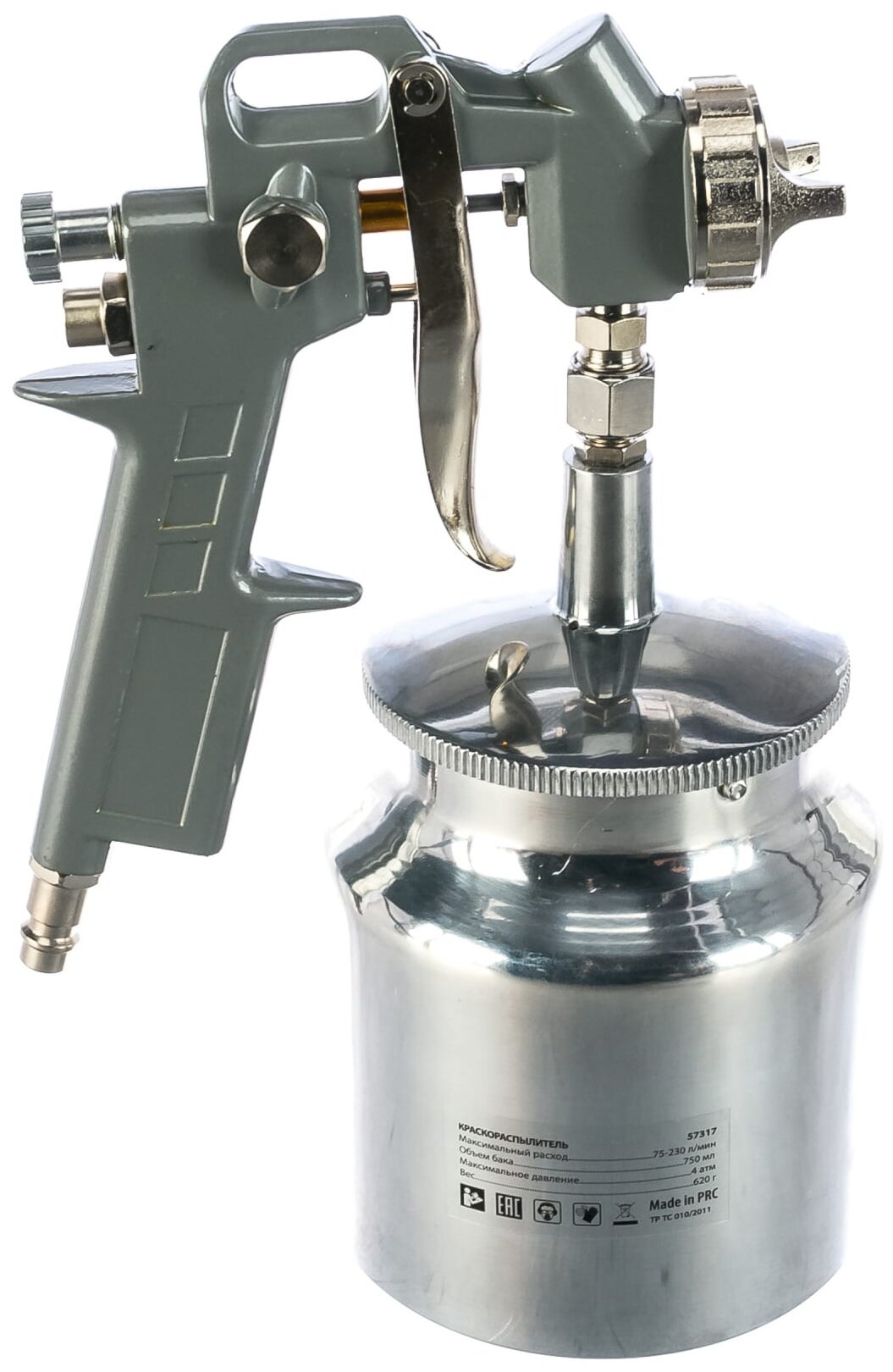 Краскораспылитель пневматический MATRIX 57317 с нижним бачком V 0,75 л, сопло D 1.2, 1.5 и 1.8 мм