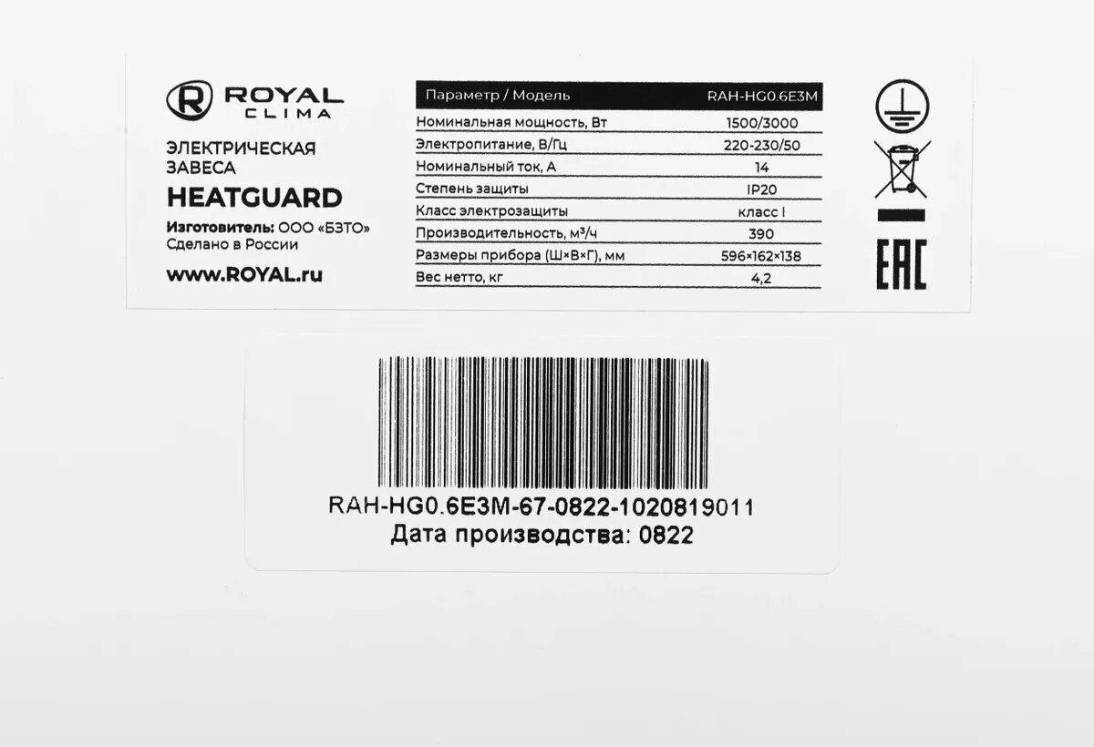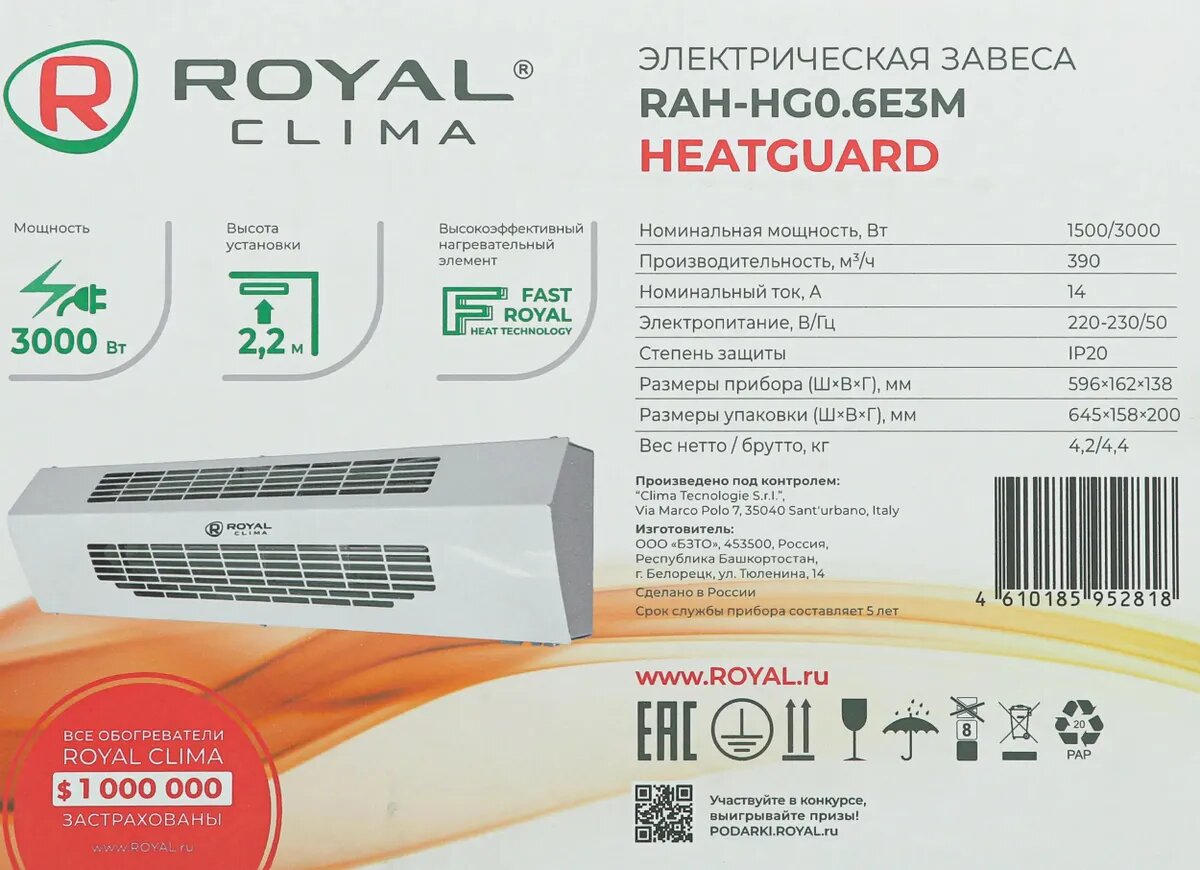 Тепловая завеса Royal Clima Heatguard RAH-HG0.6E3M, 3кВт белый интересное: