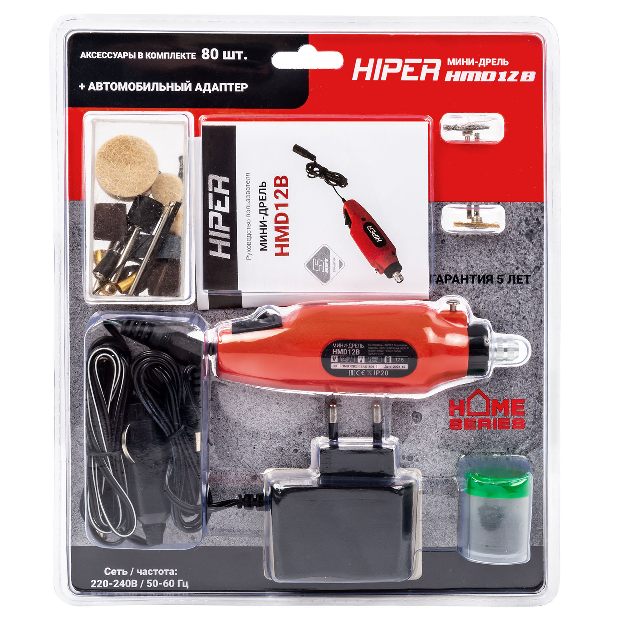 дрель-гравер, адаптер для подключения к сети 220 В, кабель для подключения к сети 12 В, оснастка 80 шт.