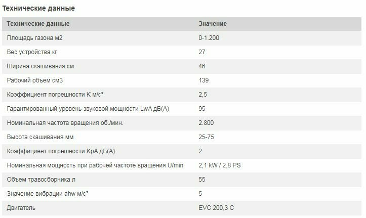 | Дополнительные функции | возможность установки мульчирующей насадки / регулировка высоты скашивания / тормоз двигателя |