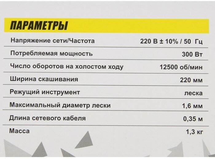 | Минусы: | Короткий провод сетевой. Тонкая леска в комплекте быстро рвется. Кнопка размотки лески не работает, Приходится всё разбирать каждые 5 минут т.к. леска тонкая... |