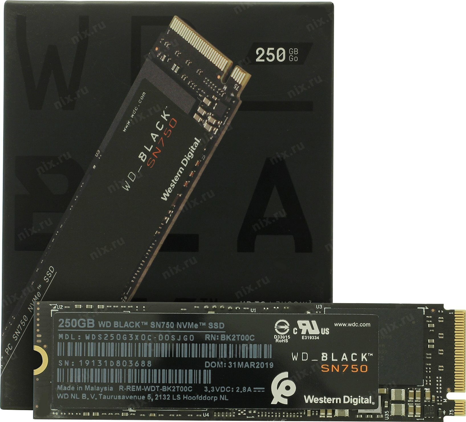 Жесткий диск SSD M.2 250Gb Western Digital WD Black SN750, 3100/1600MBs, TLC 3D NAND, 2280, PCI-E 3.0 x4 (WDS250G3X0C)