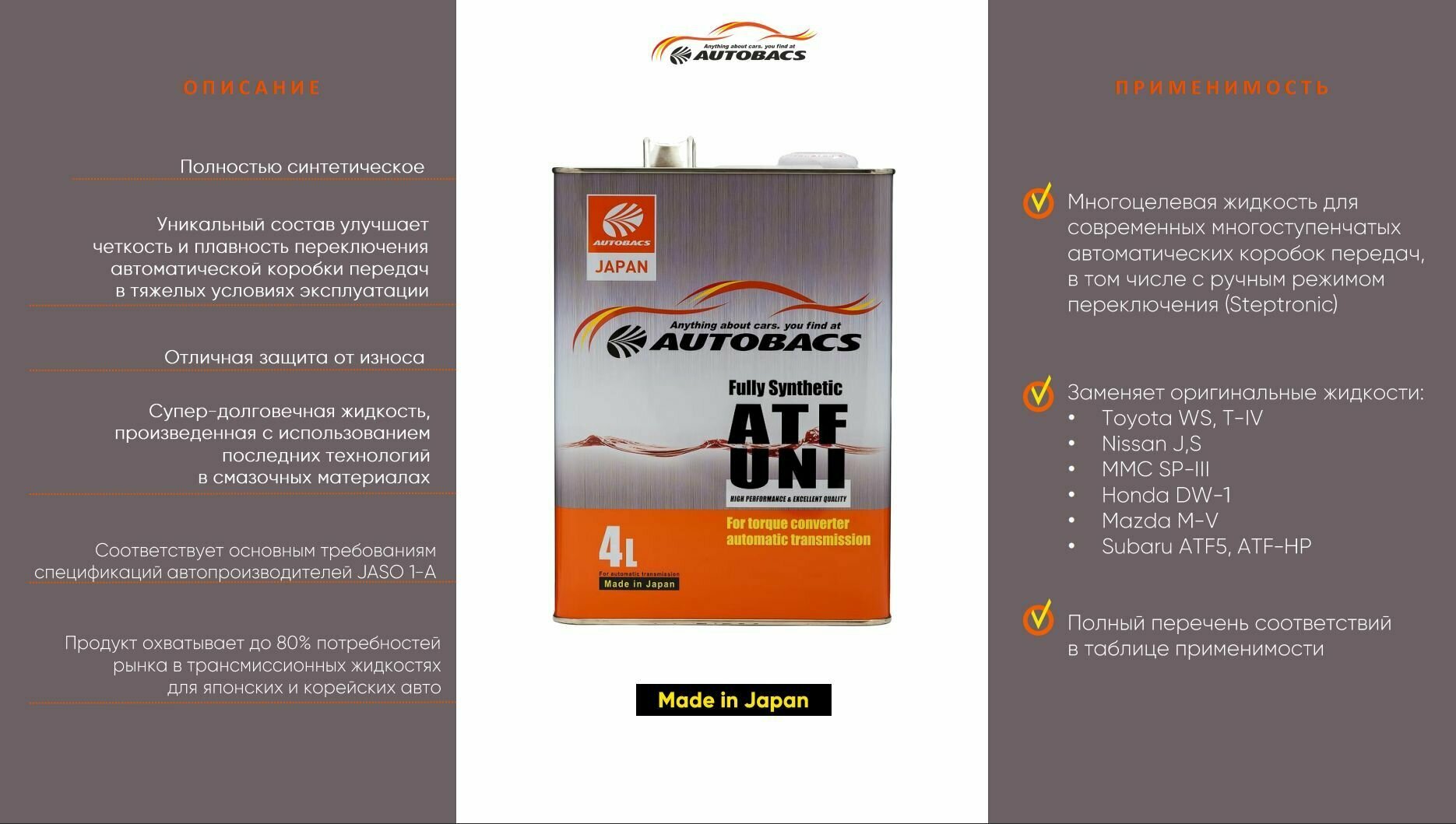 Масло AUTOBACS ATF UNI трансмиссионное 4л AUTOBACS A01555200 | цена за 1 шт интересное: